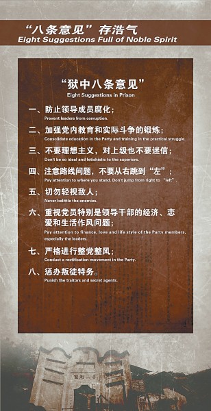 经过整理后的“狱中八条”只有96个字:一、防止领导成员腐化;二、加强党内教育和实际斗争的锻炼;三、不要理想主义,对上级也不要迷信;四、注意路线问题,不要从右跳到“左”;五、切勿轻视敌人;六、重视党员特别是领导干部的经济、恋爱和生活作风问题;七、严格进行整党整风;八、惩办叛徒特务。