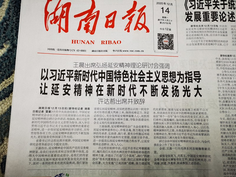 2020年12月12日至13日,中国延安精神研究会主办的“以习近平新时代中国特色社会主义思想为指导,进一步弘扬延安精神理论研讨会”在韶山宾馆召开。中共中央政治局委员、中国延安精神研究会会长王晨出席会议并讲话。