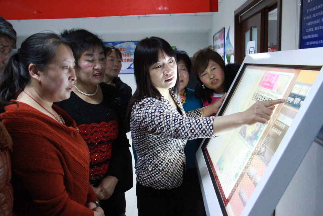 平谷区滨河街道建西社区党总支书记方彩芹(中)为社区居民讲解电子阅报使用方法