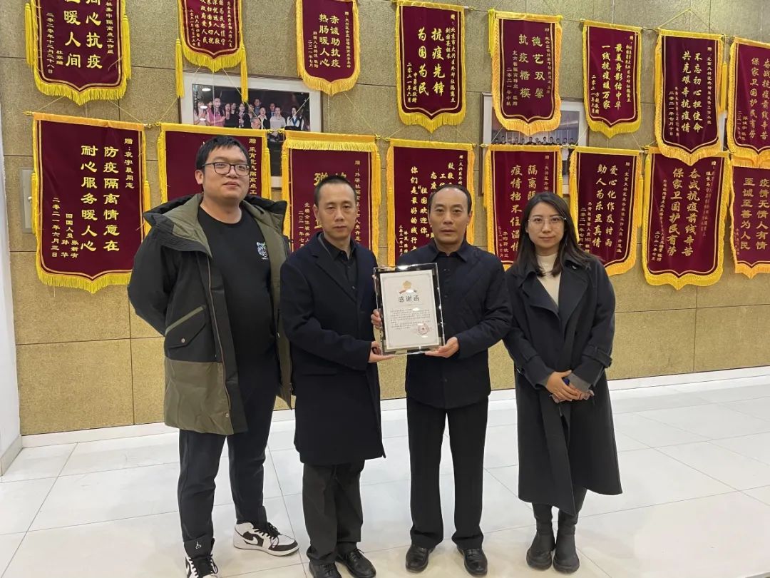 外研社对高坤(左二)和同事们在疫情防控工作中做出的贡献表示感谢