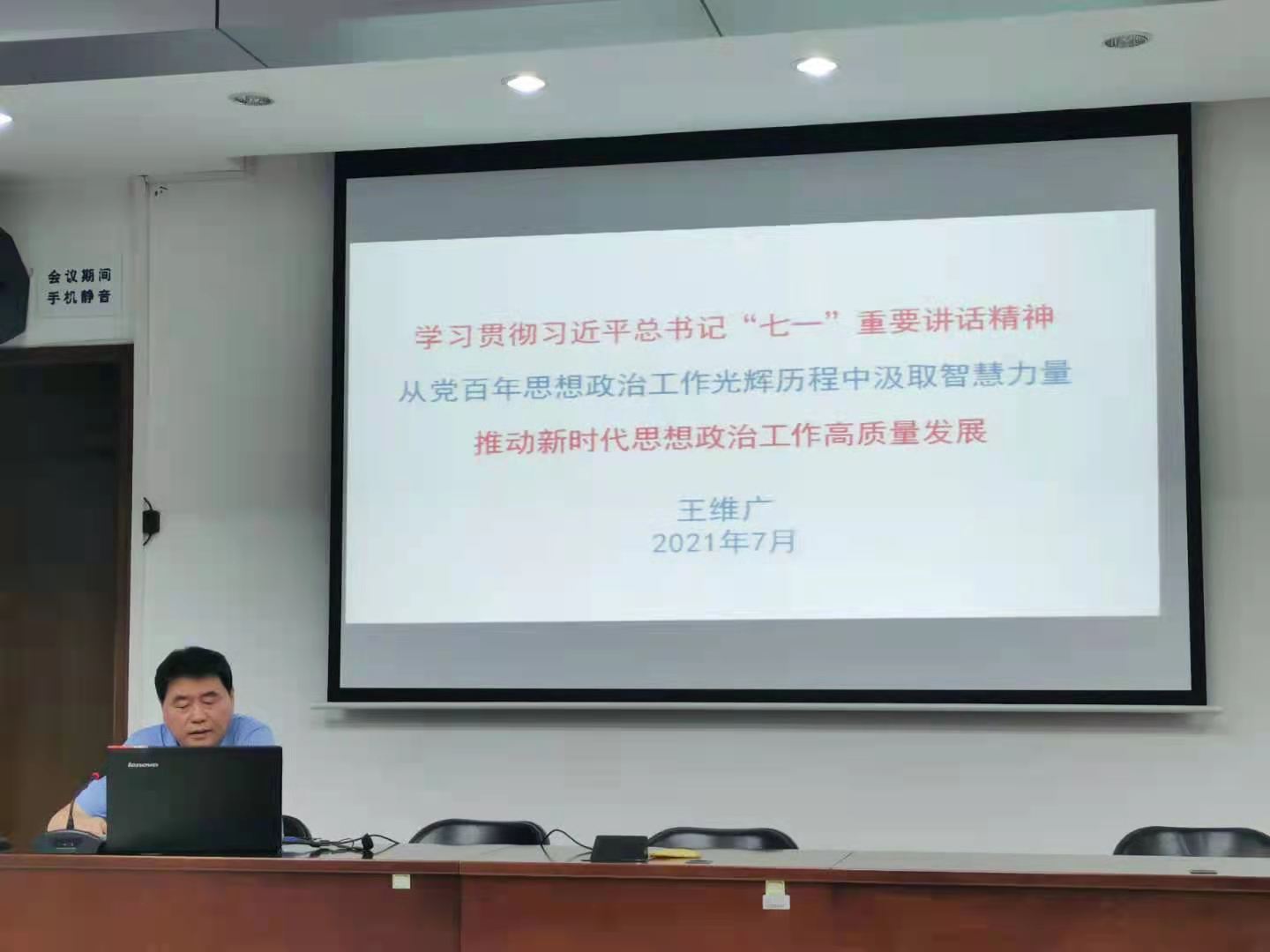 7月6日下午,市政研会副秘书长王维广给所在支部办公室、联系支部研究部全体党员讲授题为《学习贯彻习近平总书记“七一”重要讲话精神,从党百年思想政治工作光辉历程中汲取智慧力量,推动新时代思想政治工作高质量发展》的专题党课。