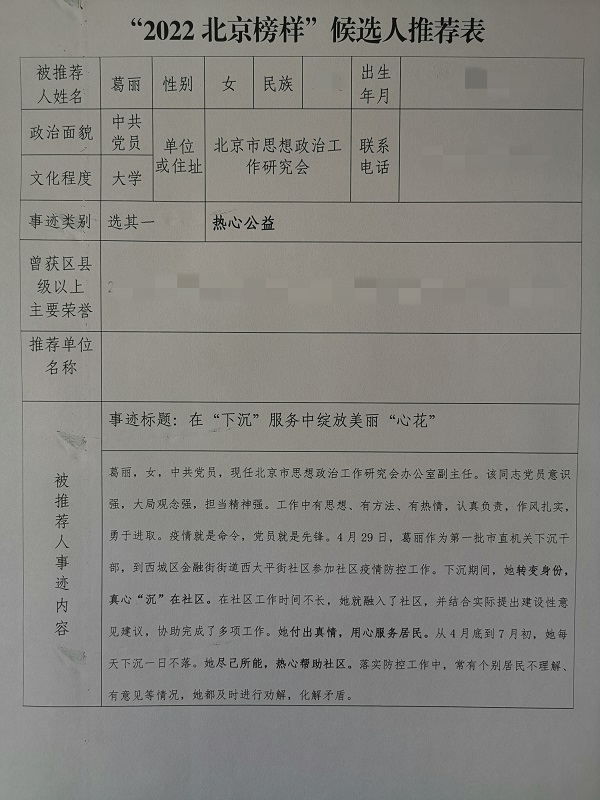 图为市政研会葛丽同志被所在下沉社区推荐为“2022北京榜样”候选人