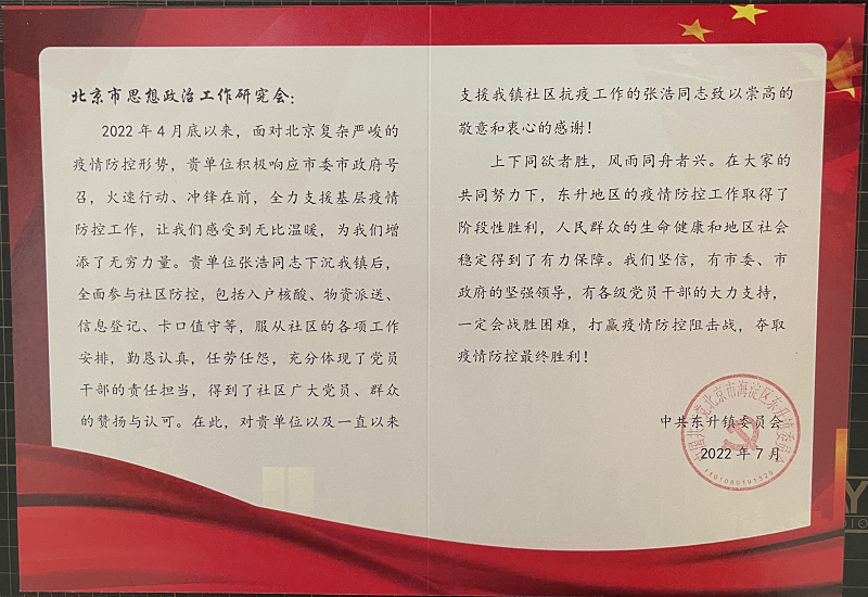 图为市政研会张浩同志下沉社区所属东升镇党委发来的感谢信