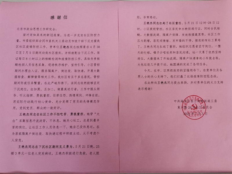 图为市政研会研究所王艳杰同志下沉社区发来的感谢信