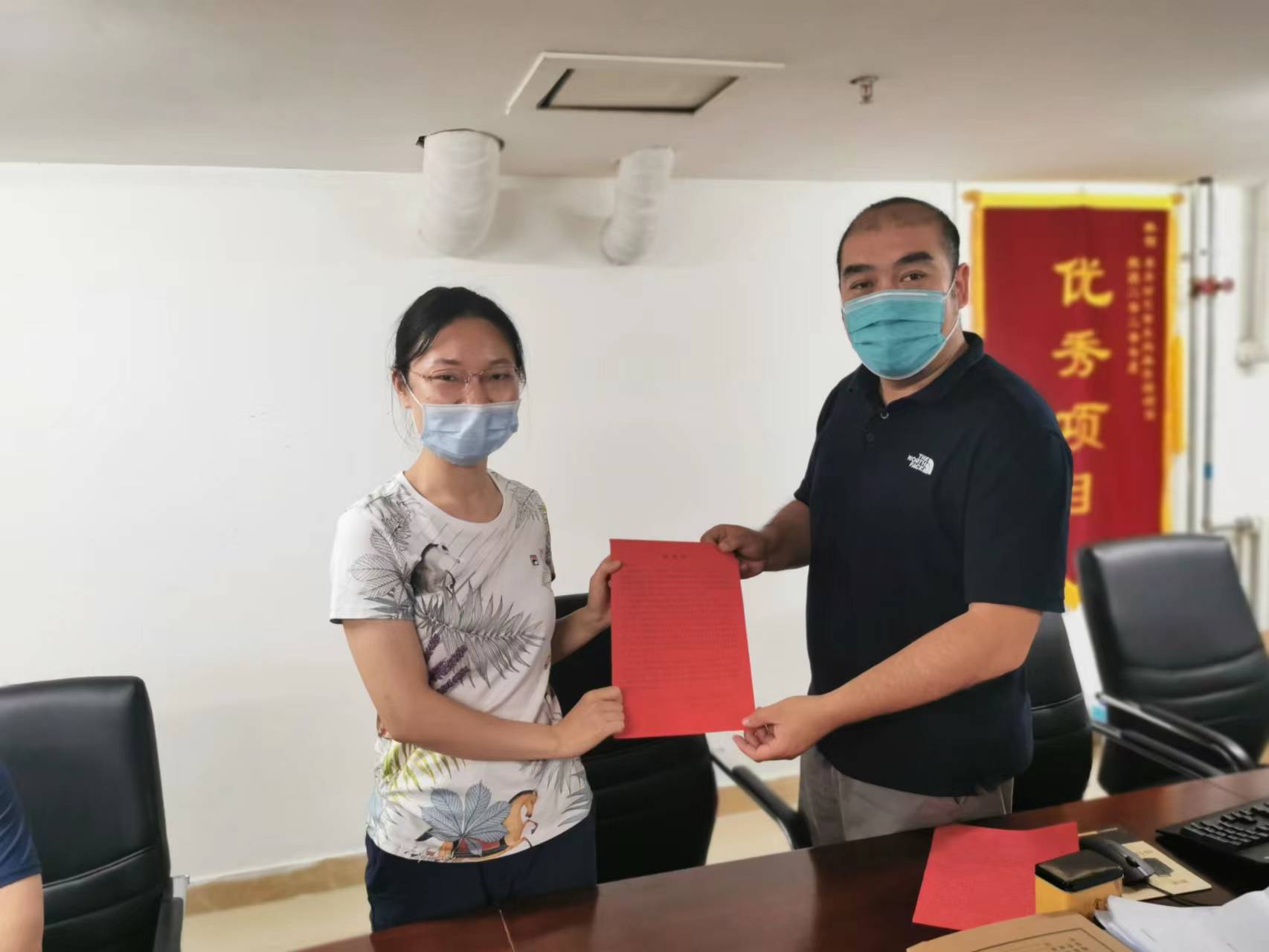 图为市政研会研究所张潇文同志下沉社区所在台湖镇党委颁发感谢信