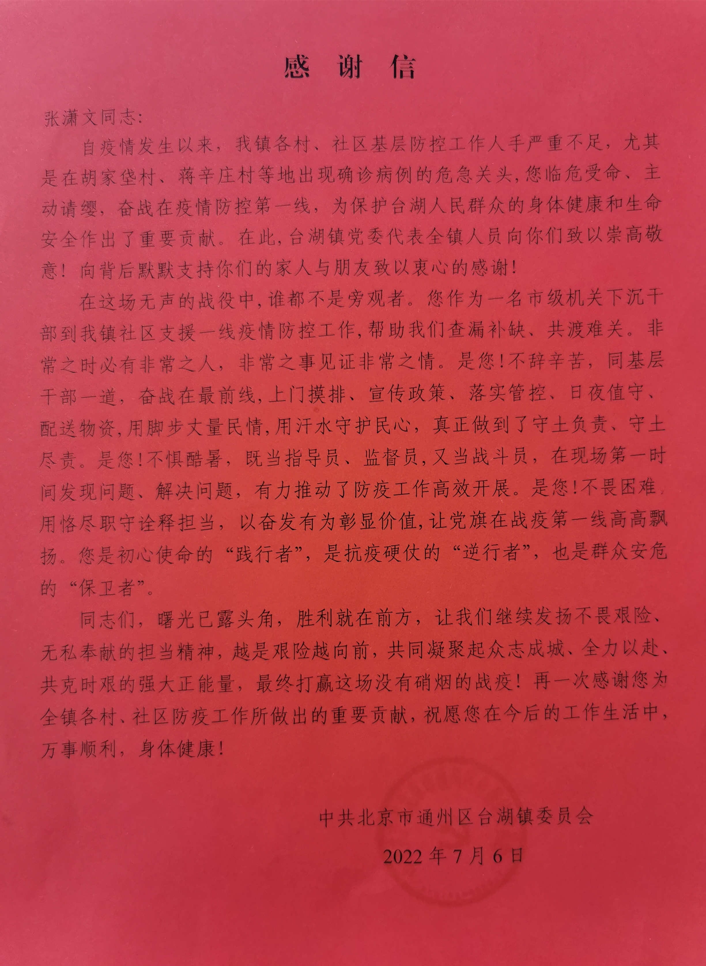 图为市政研会研究所张潇文同志下沉社区所在台湖镇党委发来的感谢信
