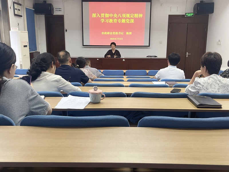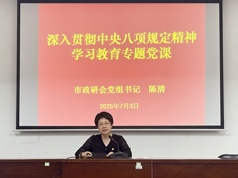 为进一步深入贯彻中央八项规定精神,推动作风建设走深走实,2025年7月3日下午,市政研会党组书记、常务副会长、一级巡视员陈清同志讲授题为《贯彻落实中央八项规定精神 持续推进市政研会作风建设》的专题党课。