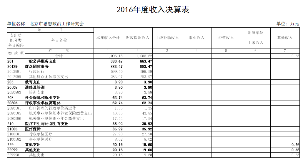 2016年度收入总计1006.18万元,其中:本年收入1005.62万元,年初结转和结余15.42万元。在本年收入中,财政拨款收入1005.62万元,占收入合计的 99.94%;其他收入0.56万元,占收入合计的0.06 %。