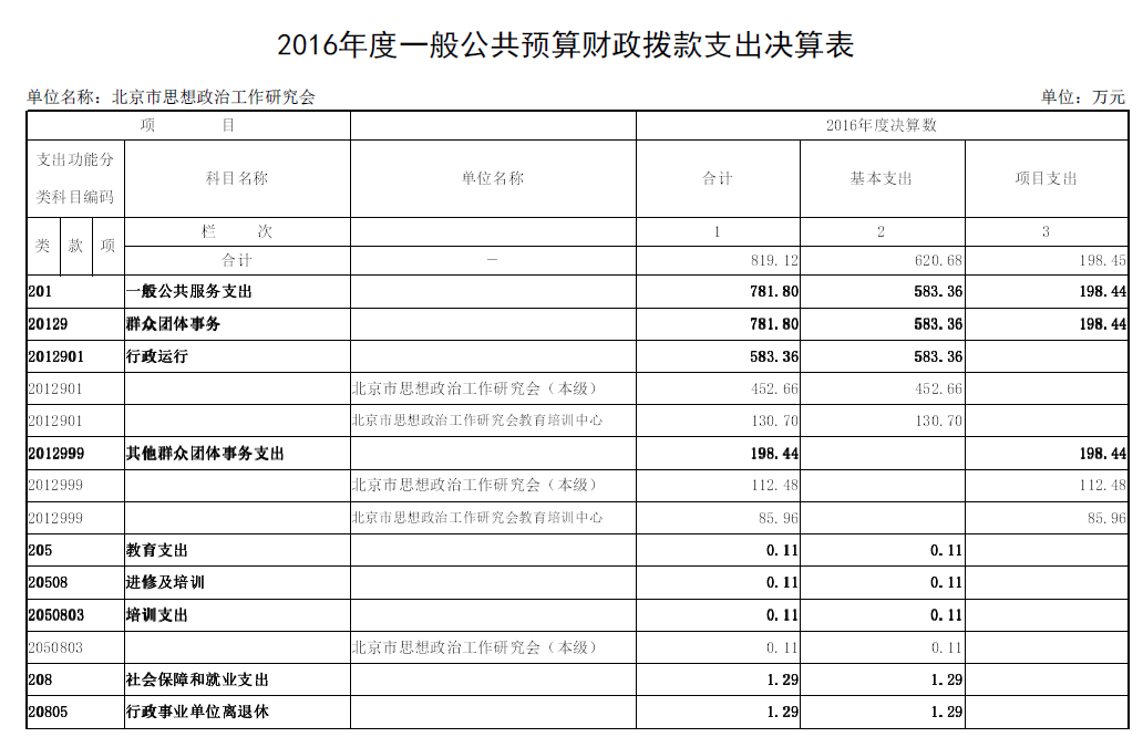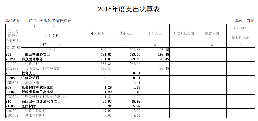 2016年度本年支出合计819.12万元,其中:基本支出 620.68万元,占支出合计的75.77%;项目支出198.45万元,占支出合计的24.23%。