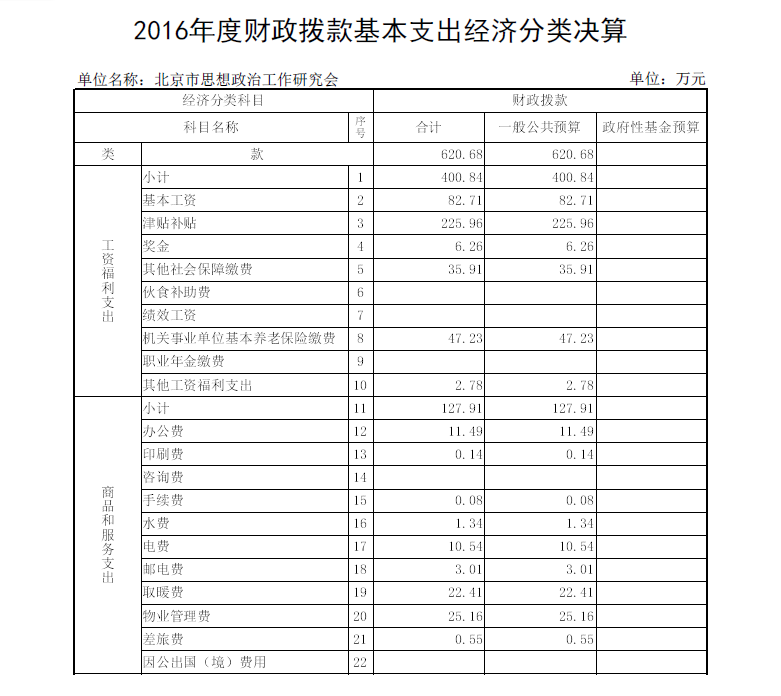 2016年本部门使用财政拨款安排基本支出620.68万元,其中:(1)工资福利支出包括津贴补贴、奖金、其他社会保障缴费、伙食补助费、绩效工资、其他工资福利等支出;(2)商品和服务支出包括办公费、印刷费、咨询费、手续费、水费、电费、邮电费、取暖费、物业管理费、差旅费、因公出国(境)费、维修(护)费、租赁费、会议费、培训费、公务接待费、专用材料费、劳务费、委托业务费、工会经费、福利费、公务用车运行维护费、其他交通费、其他商品和服务支出;(3)对个人和家庭补助支出包括离休费、退休费、抚恤金、生活补助、医疗费、助学金、奖励金、住房公积金、提租补贴、购房补贴、其他对个人和家庭的补助等支出。(4)其他资本性支出包括办公设备购置、专用设备购置等。