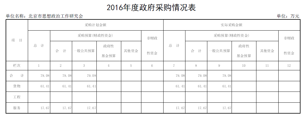 2016年北京市思想政治工作研究会政府采购支出总额79.08万元,其中:政府采购货物支出61.41万元,政府采购服务支出17.67万元。授予中小企业合同金额31.78万元,占政府采购支出总额的40.19%。