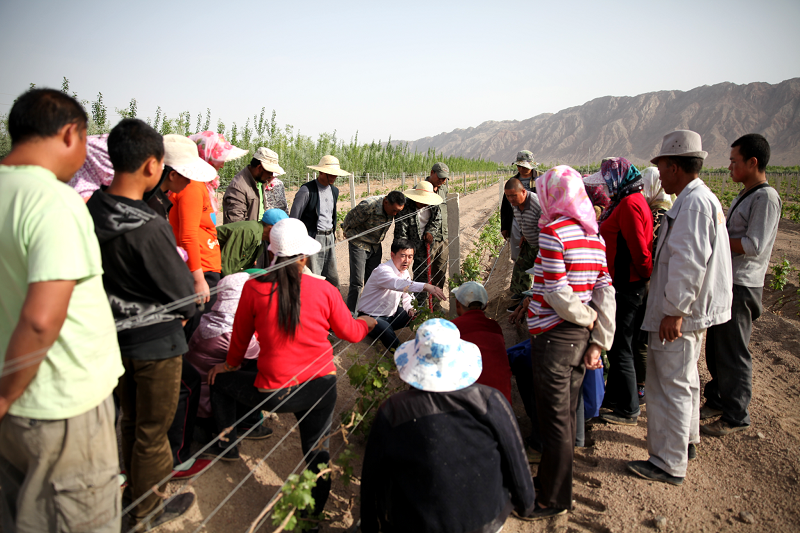 2023年4月,李德美教授在新疆焉耆回族自治县开展酿酒葡萄春季管理技术培训