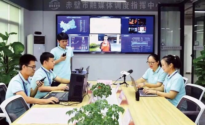 做好新时代宣传思想文化工作,重点在基层,关键在创新。建设县级融媒体中心,是打通基层宣传思想文化工作到达群众“最后一公里”的重要探索。图为2019年5月19日,湖北赤壁市组织开展“新时代文明实践 你我同行”活动,“云上赤壁”全程手机直播,赤壁市融媒体指挥调度中心对直播活动进行调度指挥。黄富清/摄