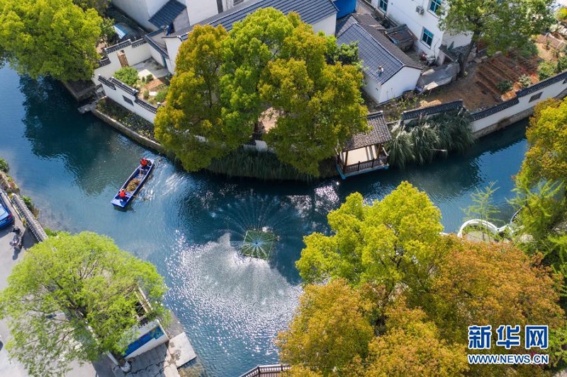 浙江省长兴县龙山街道渚山村,保洁人员进行日常河道护理巡查(4月9日摄,无人机照片)。新华社记者 徐昱 摄