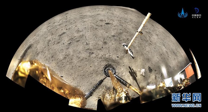 12月4日,国家航天局公布了探月工程嫦娥五号探测器在月球表面国旗展示的照片。嫦娥五号着陆器和上升器组合体全景相机环拍成像,五星红旗在月面成功展开,此外图像上方可见已完成表取采样的机械臂及采样器。新华社发(国家航天局供图)