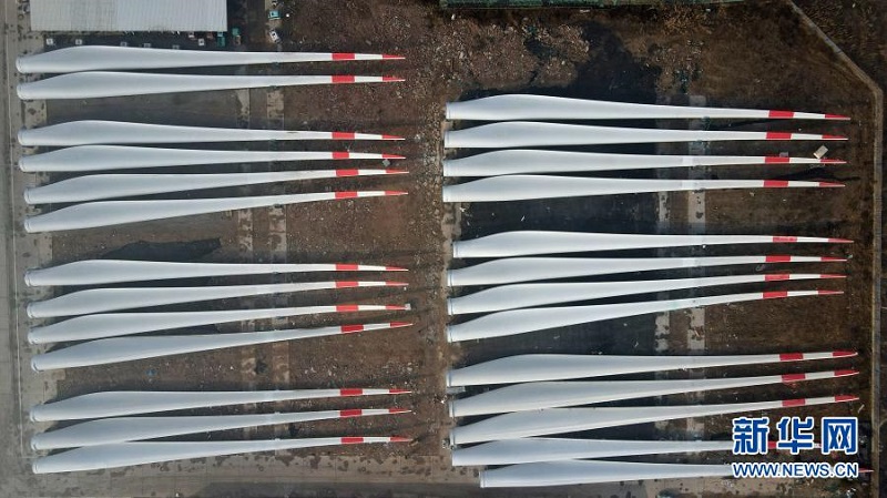 这是河北省威县一家风电设施生产企业内的大型风电机组叶片(12月8日摄,无人机照片)。新华社记者 牟宇 摄