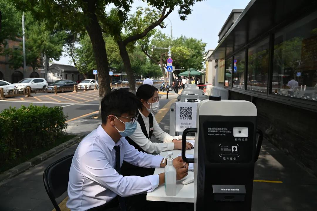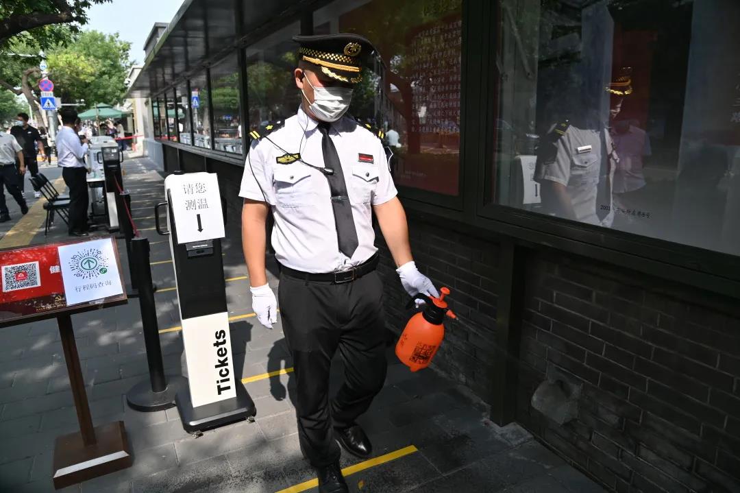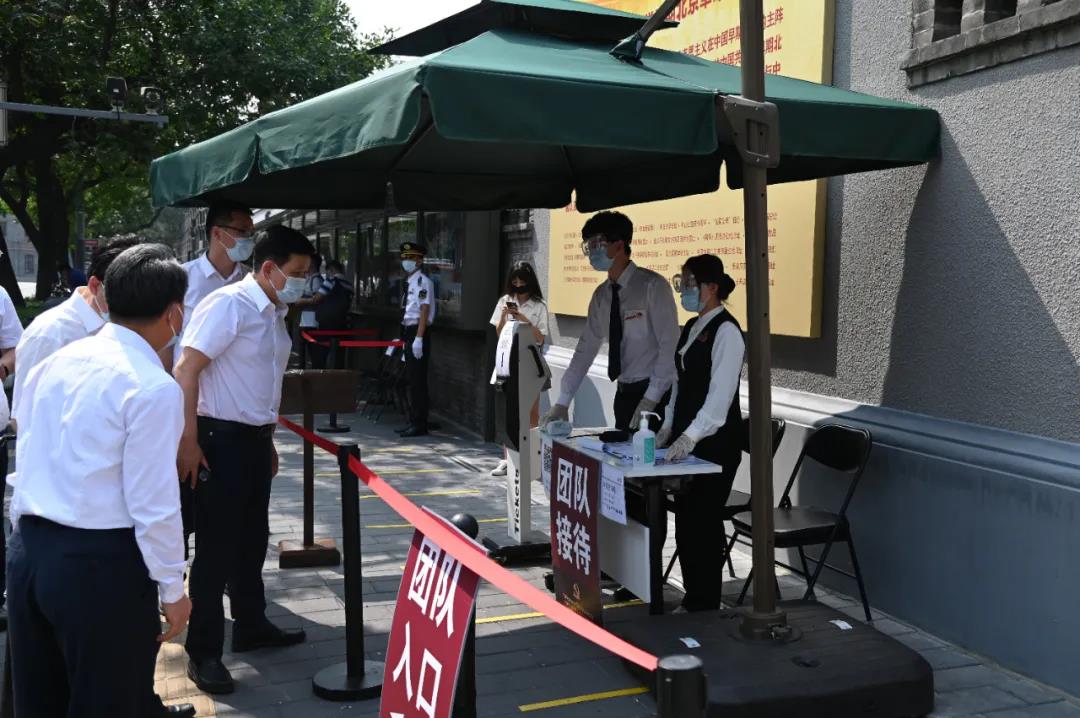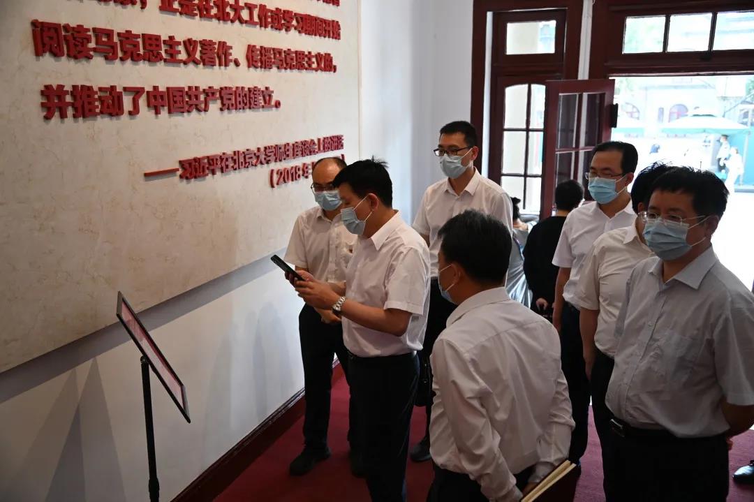 8月6日下午,北京市委常委、宣传部部长莫高义同志到北大红楼调研疫情防控工作,并就博物馆、纪念馆等社会教育资源,围绕落实学生“双减”政策,提出要求。他现场查看了入口扫码、测温、登记、安检和展厅内参观秩序,详细询问了执行限流60%政策后,观众预约情况,零散观众和团体观众占比有什么变化等问题,并饶有兴趣地拿出手机,扫描二维码收听北京电视台主持人专业讲解。