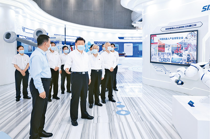 新松机器人自动化股份有限公司展厅,了解公司生产经营、自主创新情况。 新华社记者 鞠鹏/摄