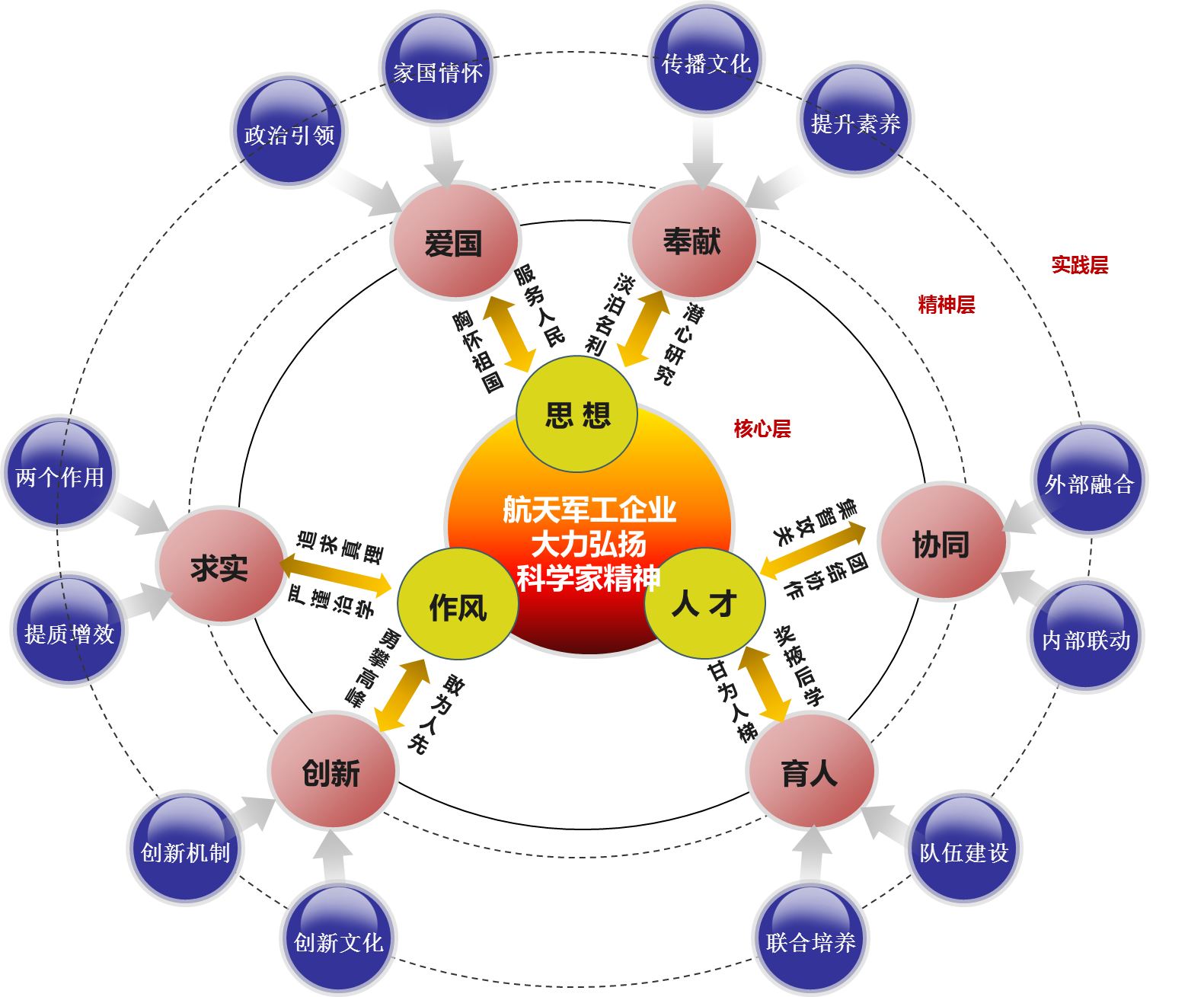 精神层:将航天企业党建工作“思想—作风—人才”建设与科学家精神“爱国、创新、求实、奉献、协同、育人”六个方面相贯通。